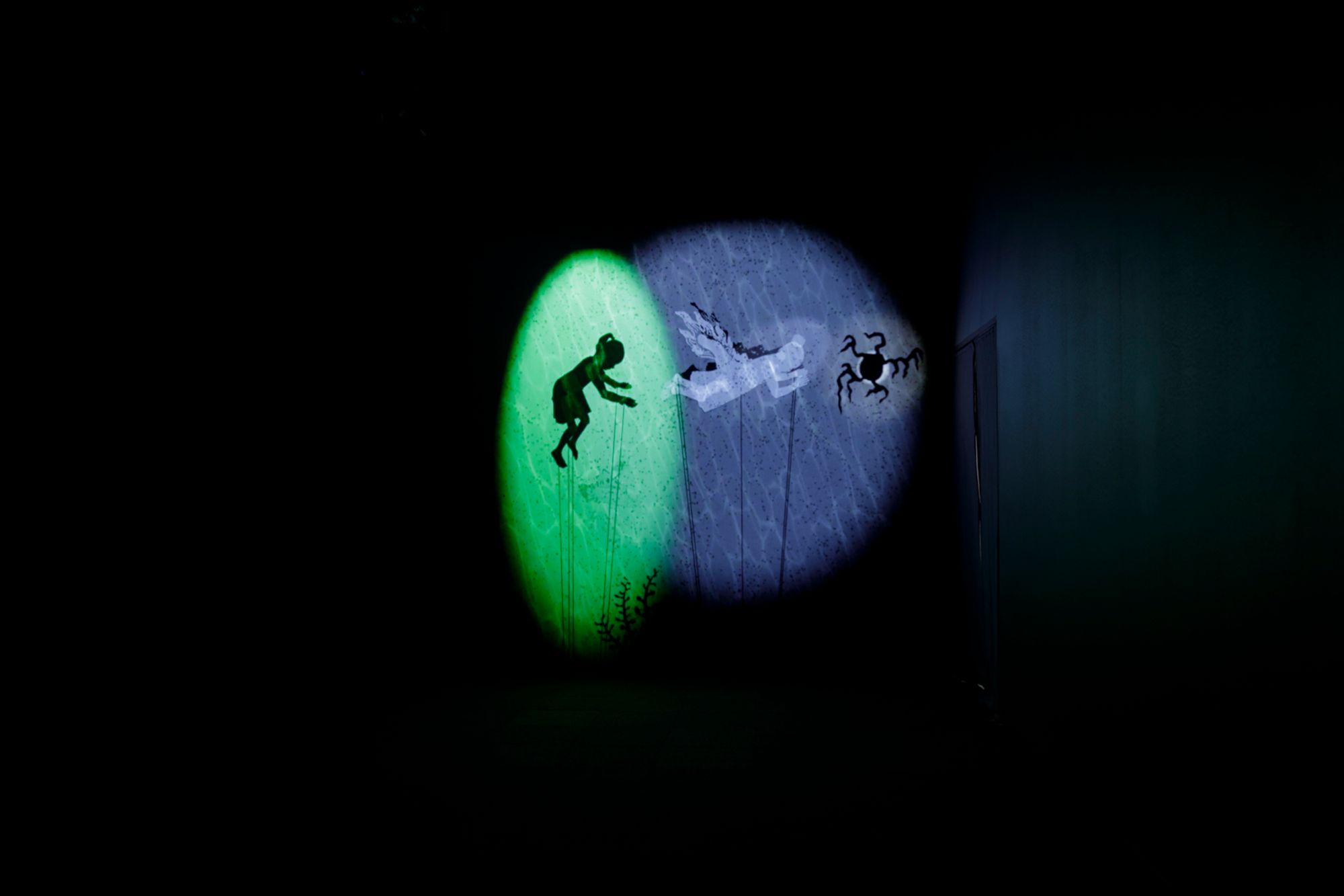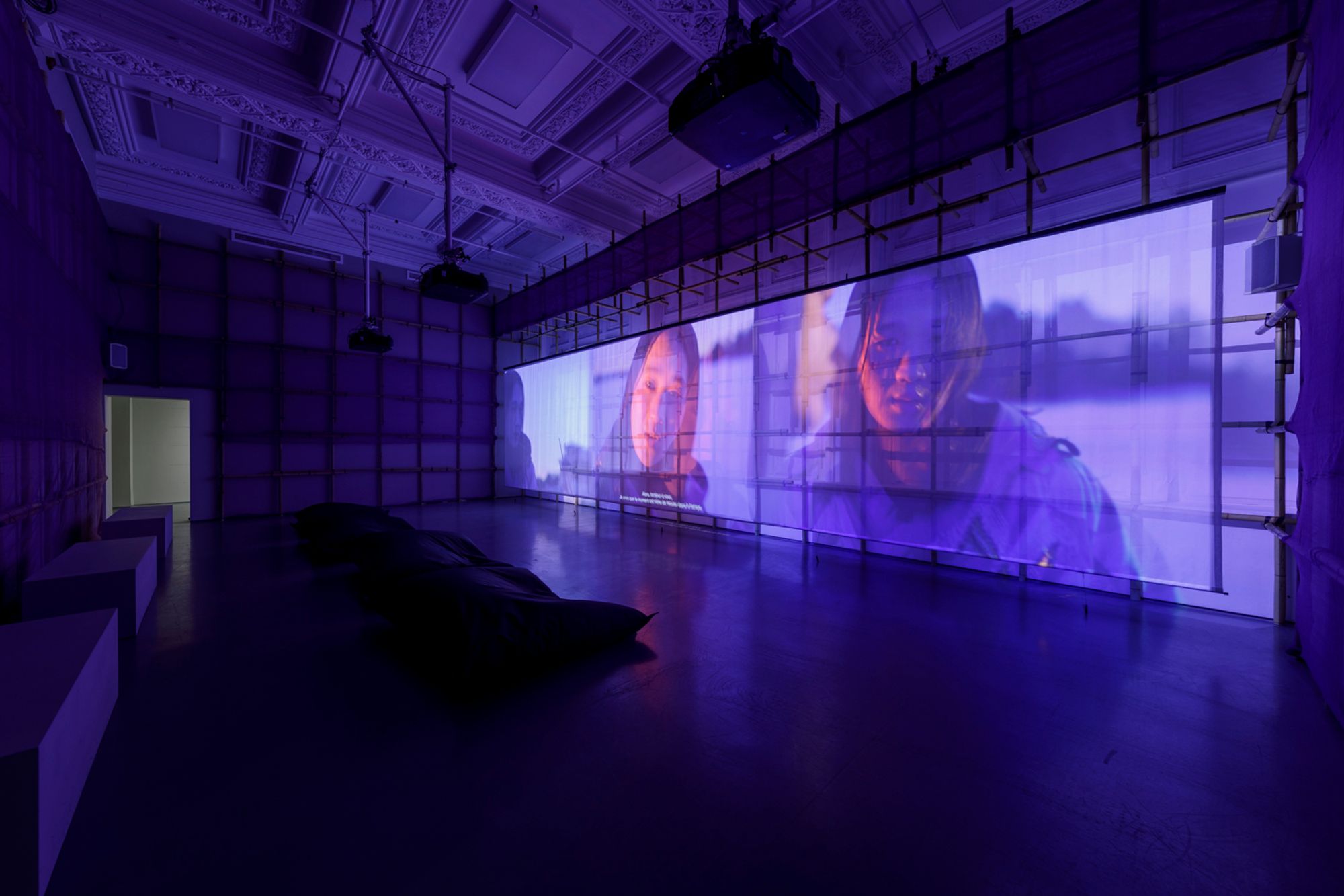 Floating Sea Palace (2024) expands on this world, offering a prequel to Tales of the Altersea. Lo Ting reappears in past and future forms, longing for his lost home, “Fragrant Harbour,” the phonetic translation of Hong Kong. The story is narrated by Singing Chef, a former cook on the dragon ship, as it encounters a storm in the North Sea, leading it to sink—setting the stage for Tales of the Altersea. For the exhibition at PHI, Lam has created an environment of bamboo inspired by the cultural and architectural history of Hong Kong and Southern China. The film is projected onto a translucent scrim that allows the spill of light and figures onto surfaces behind it. The bamboo scaffolding frames the screen, bringing Lam’s vision full circle–an immersive world of shadows, memory, and loss, where time and space continue to shift like the tide.
